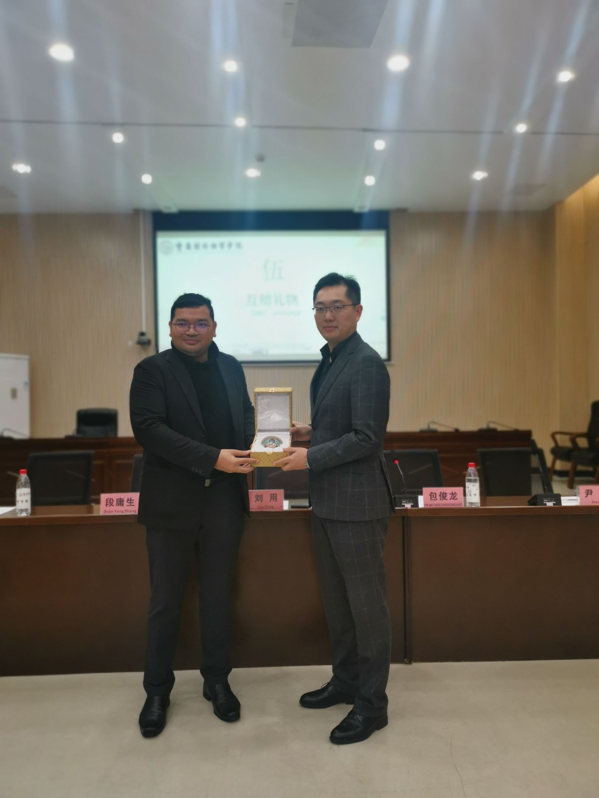 4月9日上午, 2024年度第一期泰国来华研学团开班仪式在合川A校区9106举行。泰国乌隆他尼皇家大学人文学院中文系包俊龙主任、泰国盛唐文化教育集团经理马军山先生,重庆对外经贸学院国际学院刘用院长、文学与创意传播学院常务副院长段庸生教授、保卫处尹丽科长等出席仪式。