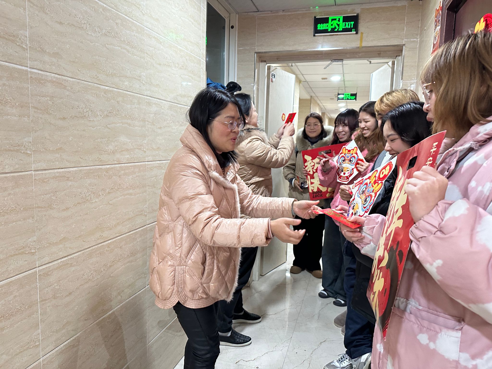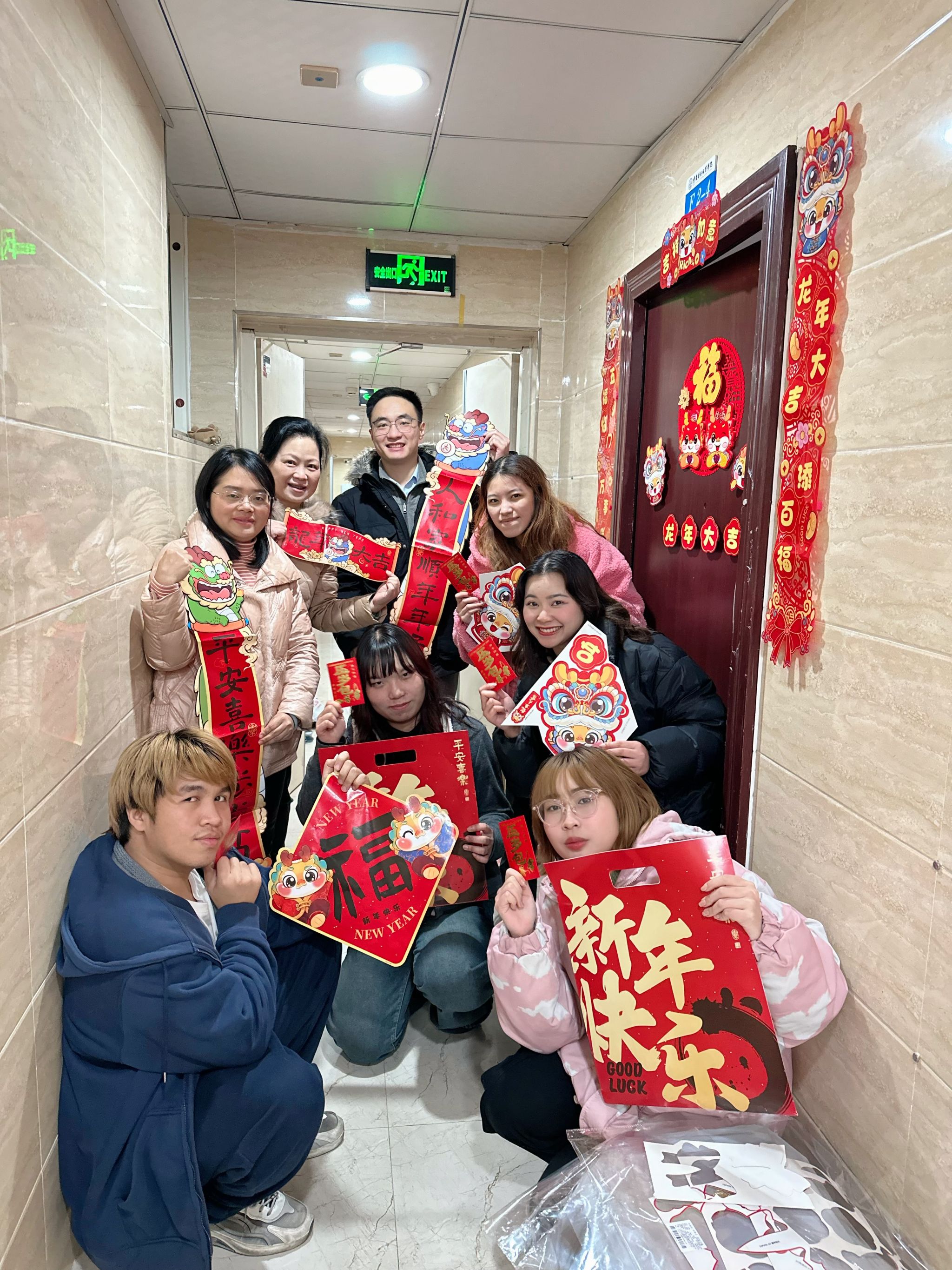 李艳副院长详细询问了同学们的假期学习、生活情况,以及春节期间的安排等,田原副院长叮嘱同学们假期安全防护,保持身心健康,祝愿同学们在中国度过一个欢乐祥和的龙年春节,并为同学们送上新春礼品和压岁红包。师生们一起粘窗花、贴春联,现场充满温馨欢乐的节日气氛。